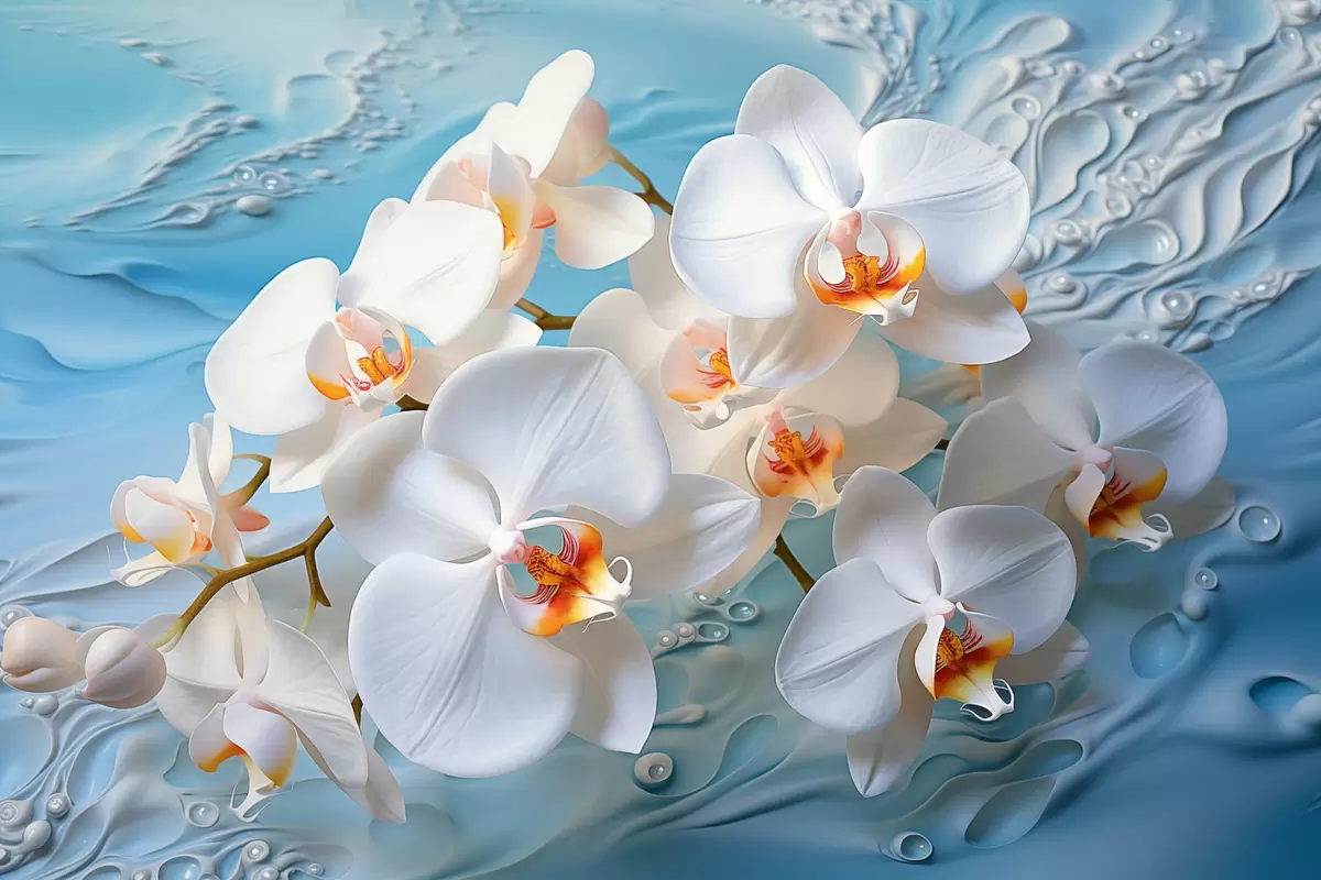 Poster Orquídeas blancas, dispuestas sobre una superficie azul claro con gotas de agua, iluminación suave f44401