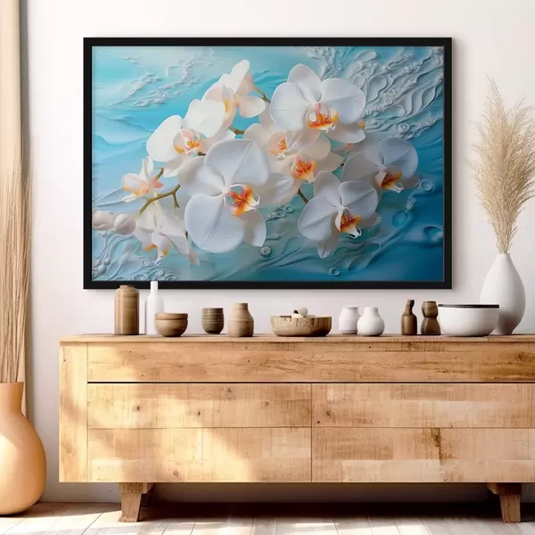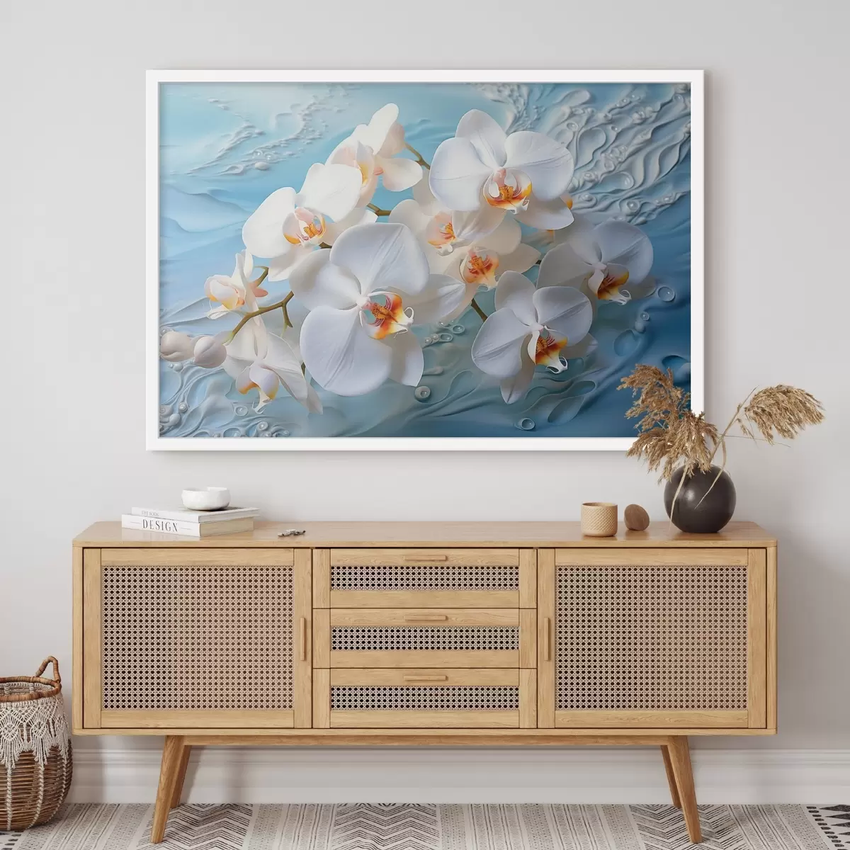 Poster Orquídeas blancas, dispuestas sobre una superficie azul claro con gotas de agua, iluminación suave Nr f44401