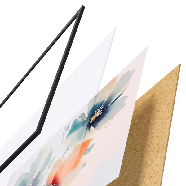 El póster consta de marco, plexiglás, imagen impresa y soporte de aglomerado. El póster puede colgarse inmediatamente en la pared gracias a los soportes de la parte posterior.