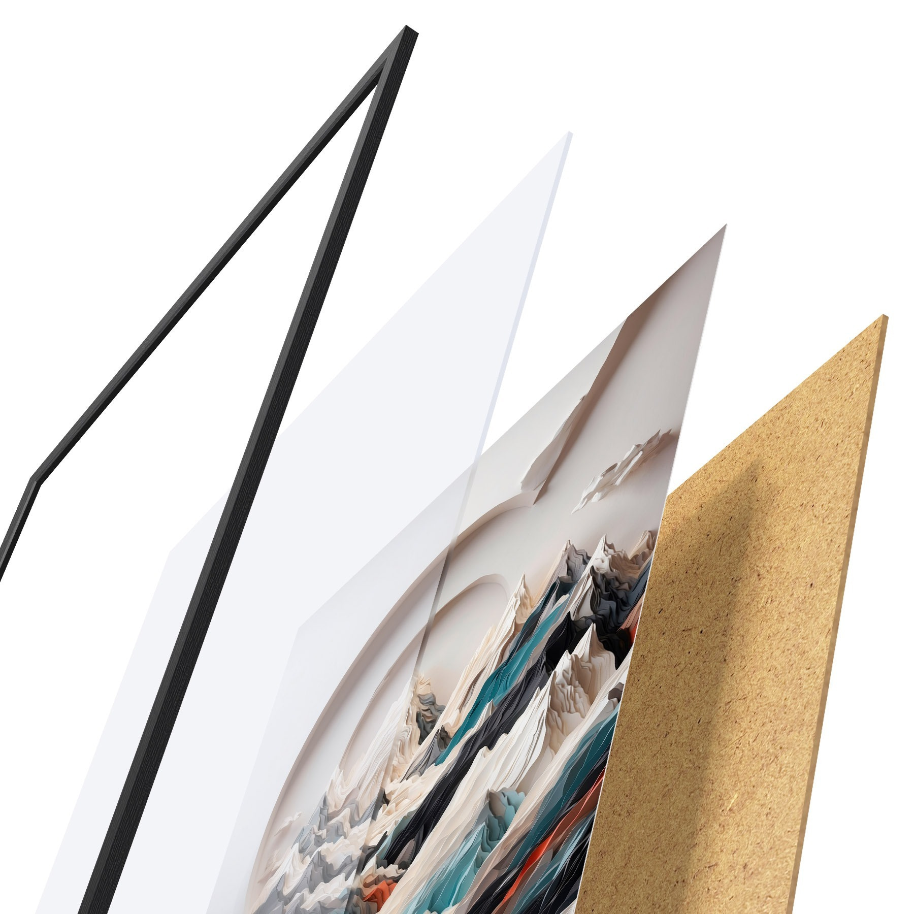 El póster consta de marco, plexiglás, imagen impresa y soporte de aglomerado. El póster puede colgarse inmediatamente en la pared gracias a los soportes de la parte posterior.
