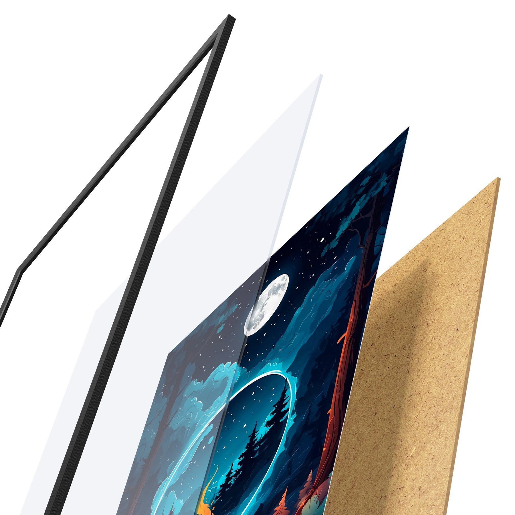 El póster consta de marco, plexiglás, imagen impresa y soporte de aglomerado. El póster puede colgarse inmediatamente en la pared gracias a los soportes de la parte posterior.
