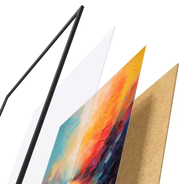 El póster consta de marco, plexiglás, imagen impresa y soporte de aglomerado. El póster puede colgarse inmediatamente en la pared gracias a los soportes de la parte posterior.