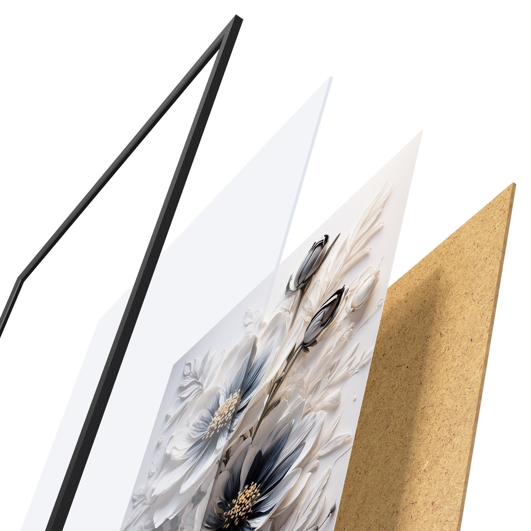 El póster consta de marco, plexiglás, imagen impresa y soporte de aglomerado. El póster puede colgarse inmediatamente en la pared gracias a los soportes de la parte posterior.