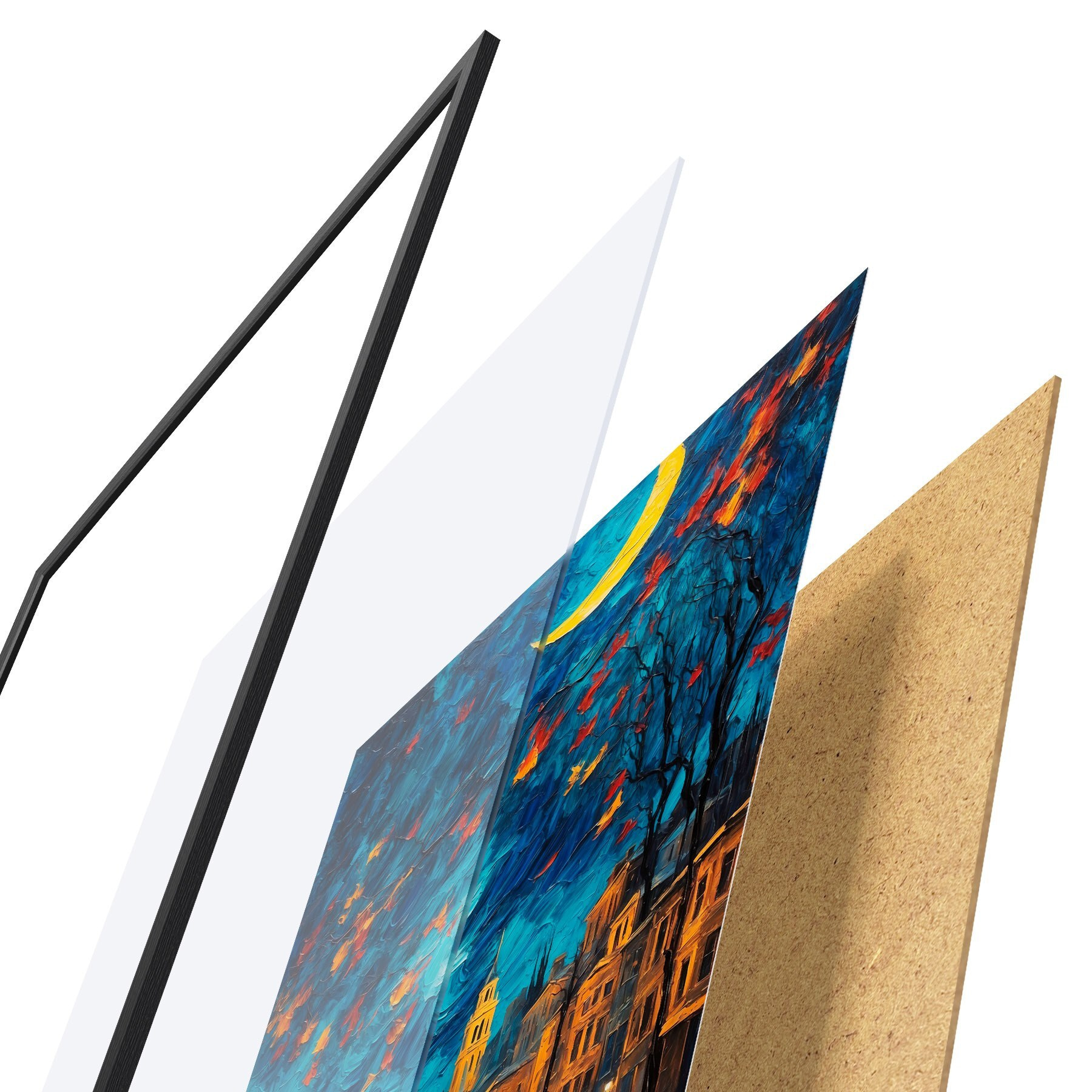 El póster consta de marco, plexiglás, imagen impresa y soporte de aglomerado. El póster puede colgarse inmediatamente en la pared gracias a los soportes de la parte posterior.