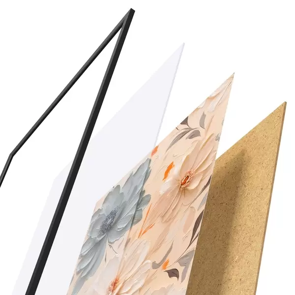 El póster consta de marco, plexiglás, imagen impresa y soporte de aglomerado. El póster puede colgarse inmediatamente en la pared gracias a los soportes de la parte posterior.