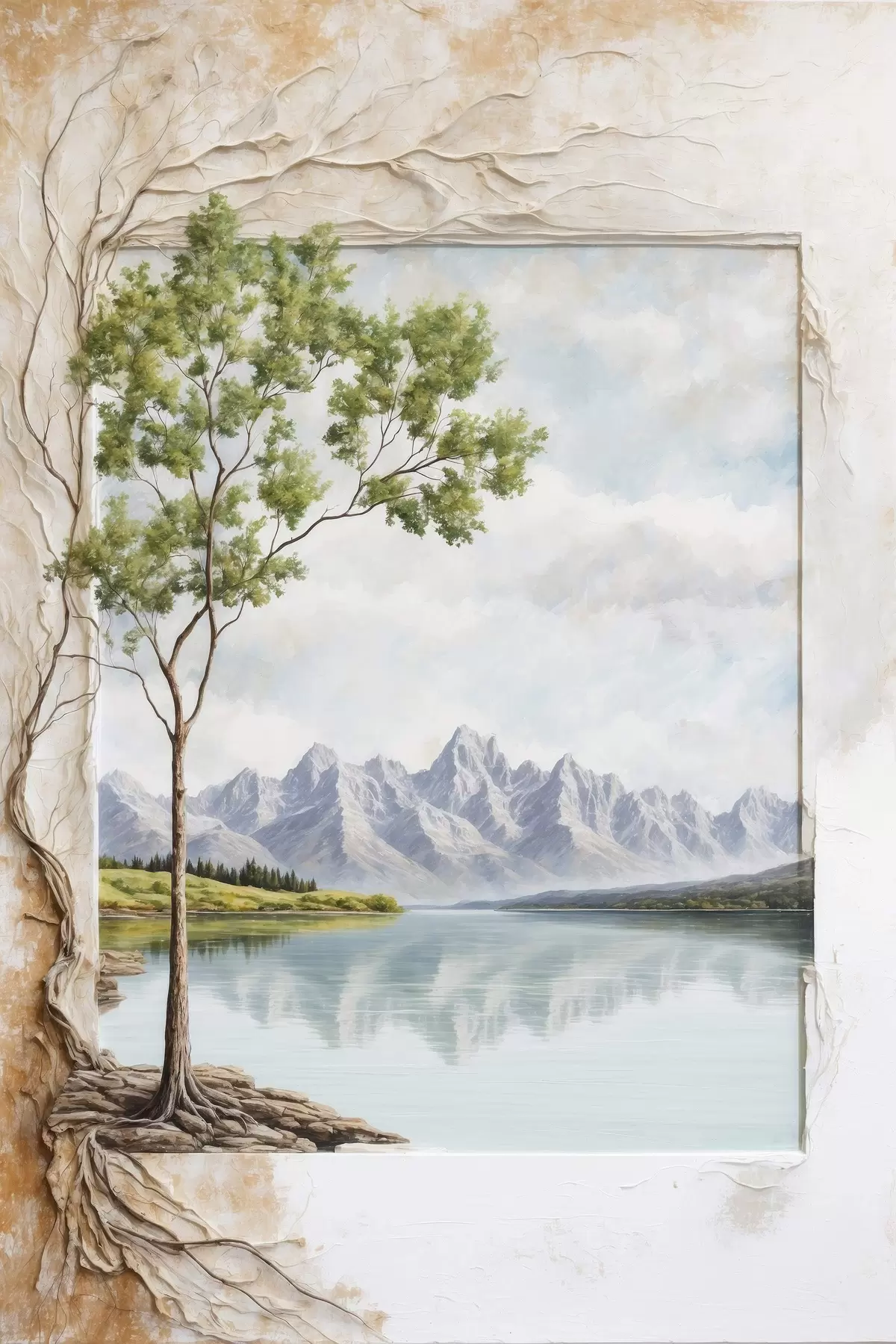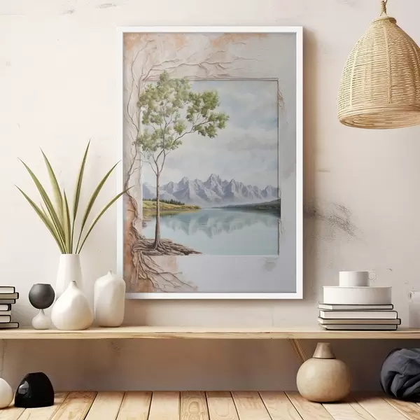 Poster Vista sobre el lago y montañas nevadas en el encuadre f44458