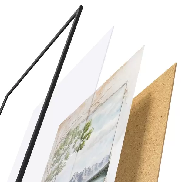 El póster consta de marco, plexiglás, imagen impresa y soporte de aglomerado. El póster puede colgarse inmediatamente en la pared gracias a los soportes de la parte posterior.