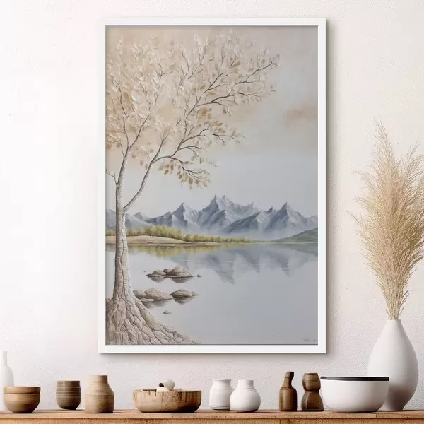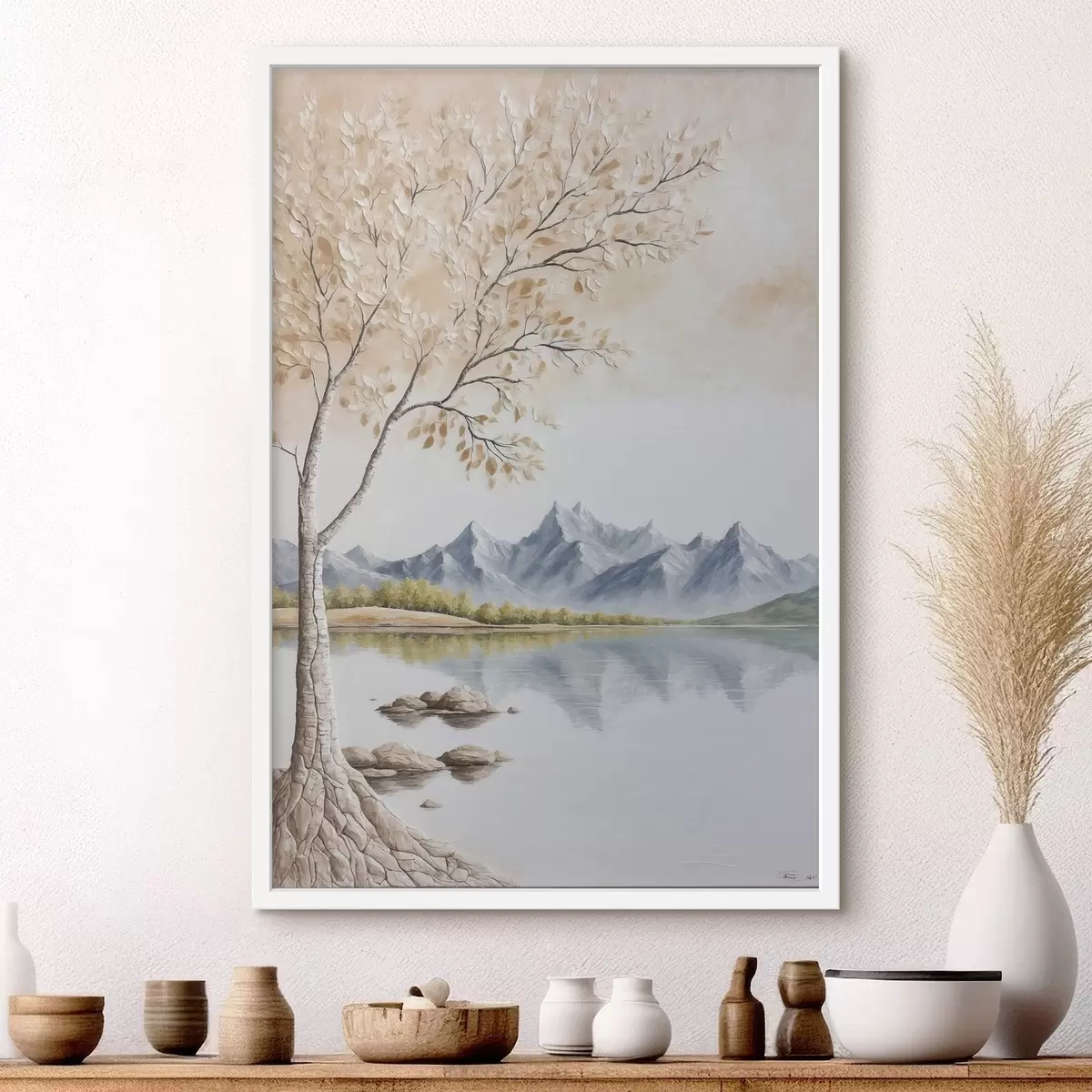 Poster Árbol sobre lago y montañas nevadas de fondo Nr f44459