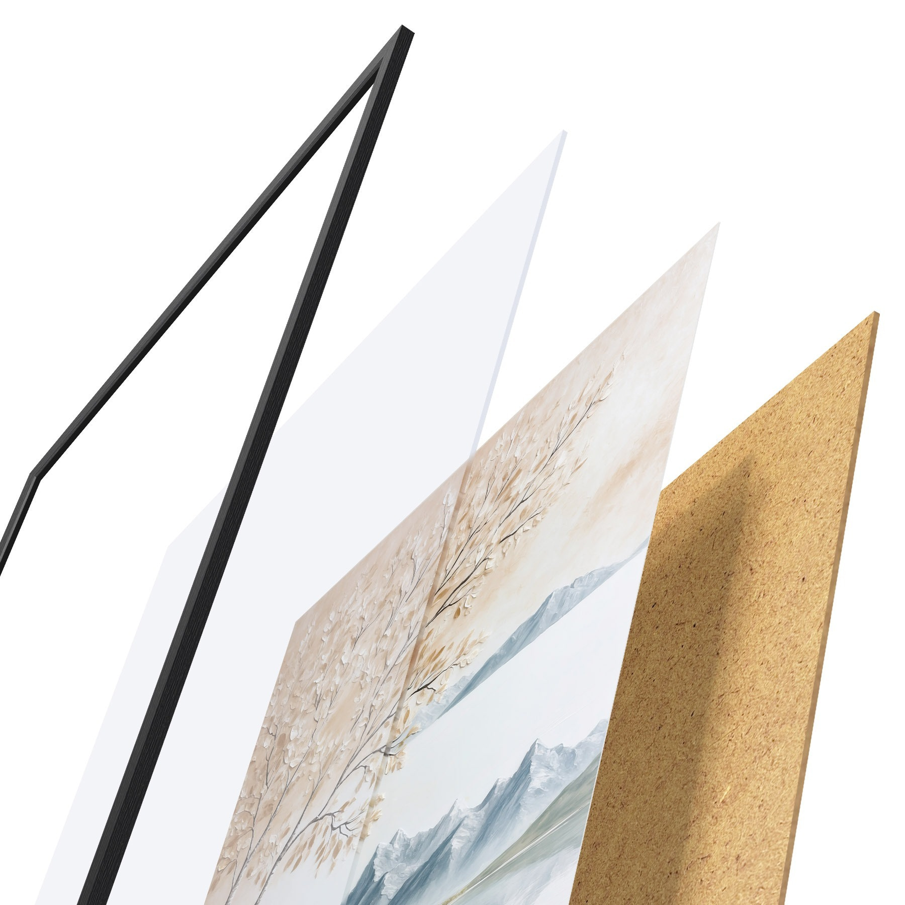 El póster consta de marco, plexiglás, imagen impresa y soporte de aglomerado. El póster puede colgarse inmediatamente en la pared gracias a los soportes de la parte posterior.