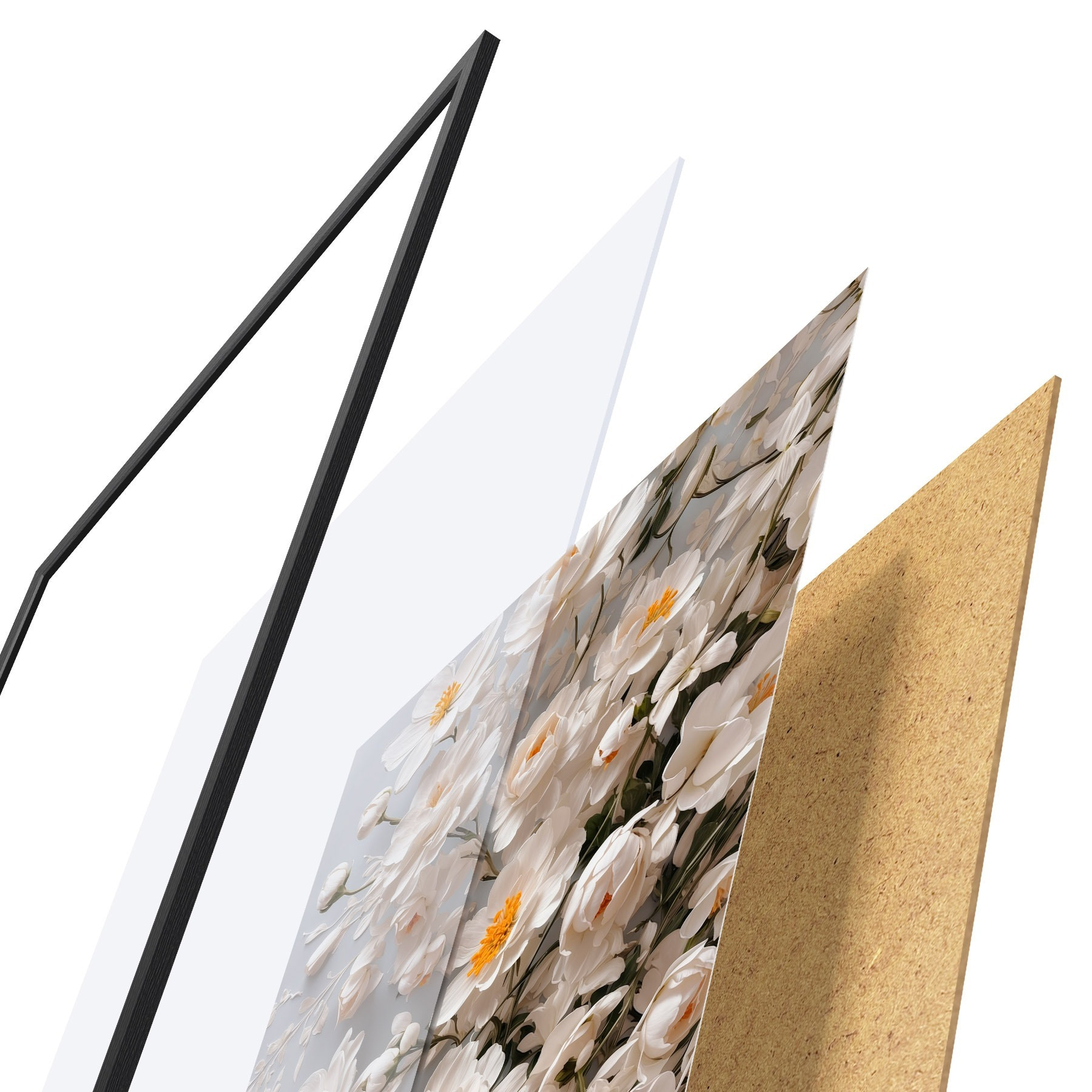 El póster consta de marco, plexiglás, imagen impresa y soporte de aglomerado. El póster puede colgarse inmediatamente en la pared gracias a los soportes de la parte posterior.