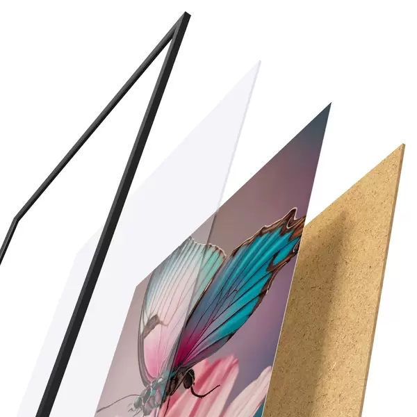 El póster consta de marco, plexiglás, imagen impresa y soporte de aglomerado. El póster puede colgarse inmediatamente en la pared gracias a los soportes de la parte posterior.