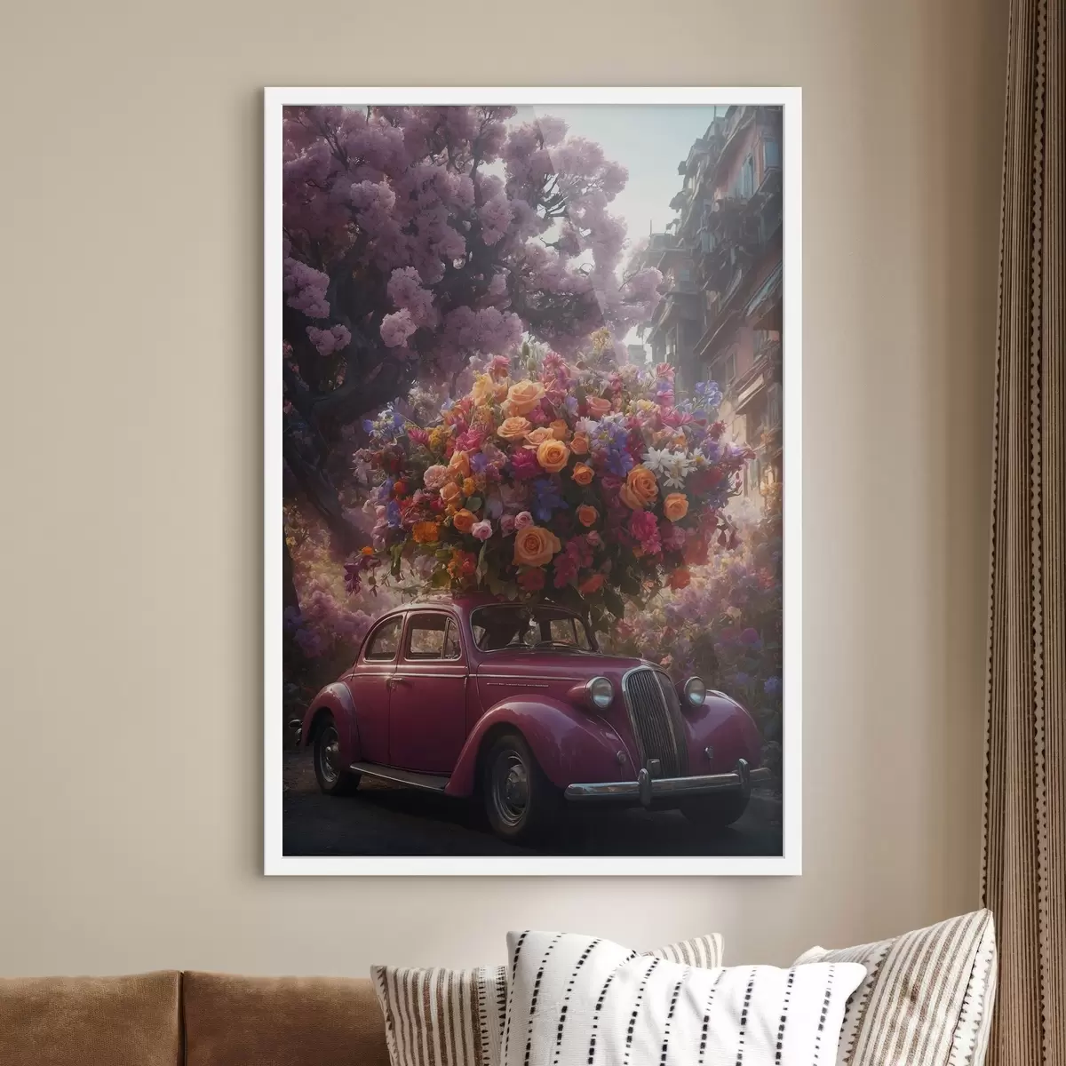 Poster Coche retro y un enorme ramo de flores Nr f44471