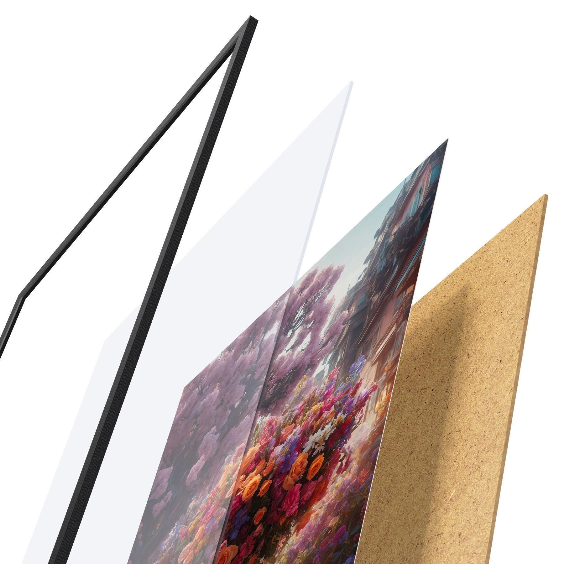 El póster consta de marco, plexiglás, imagen impresa y soporte de aglomerado. El póster puede colgarse inmediatamente en la pared gracias a los soportes de la parte posterior.