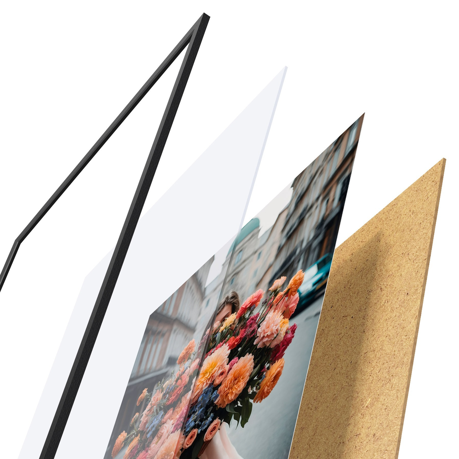 El póster consta de marco, plexiglás, imagen impresa y soporte de aglomerado. El póster puede colgarse inmediatamente en la pared gracias a los soportes de la parte posterior.