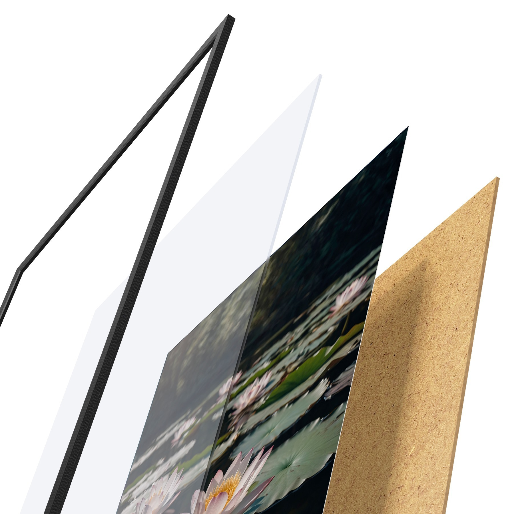 El póster consta de marco, plexiglás, imagen impresa y soporte de aglomerado. El póster puede colgarse inmediatamente en la pared gracias a los soportes de la parte posterior.