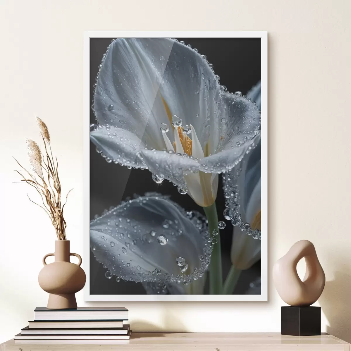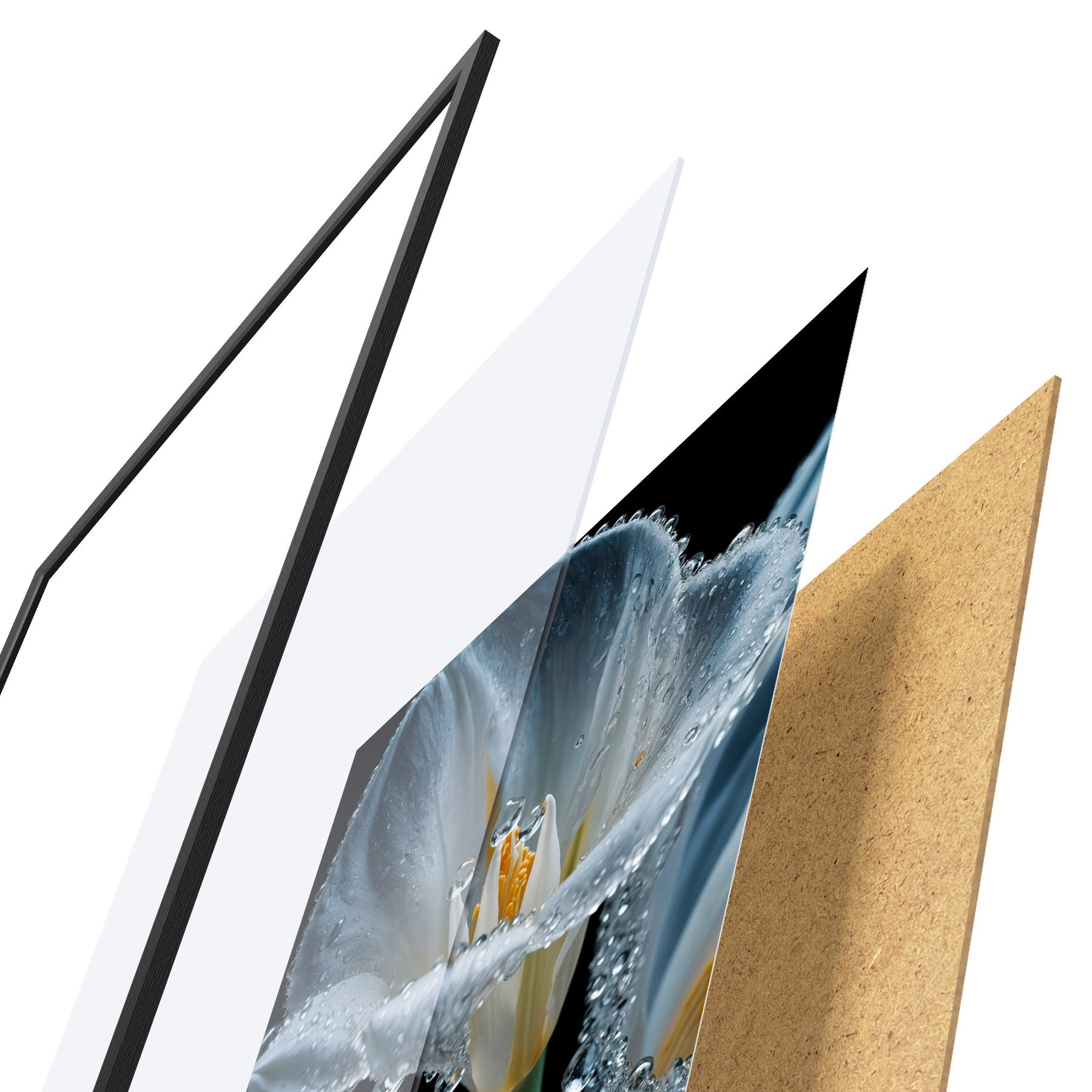 El póster consta de marco, plexiglás, imagen impresa y soporte de aglomerado. El póster puede colgarse inmediatamente en la pared gracias a los soportes de la parte posterior.