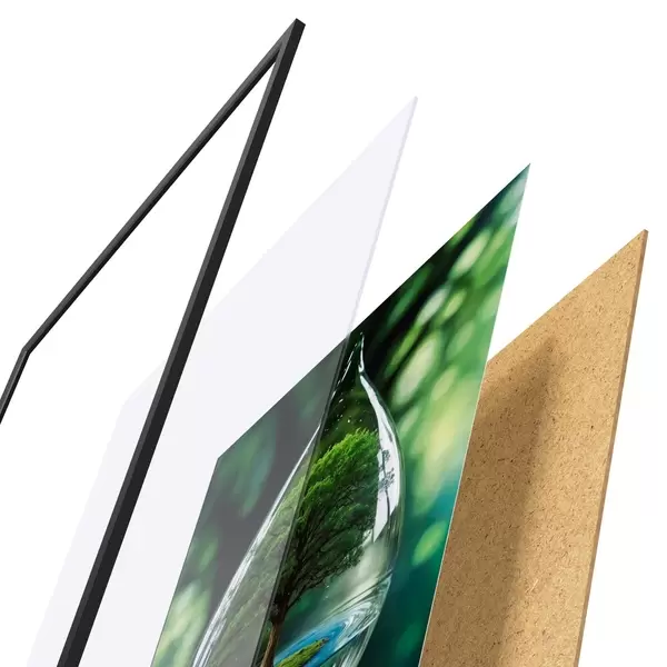 El póster consta de marco, plexiglás, imagen impresa y soporte de aglomerado. El póster puede colgarse inmediatamente en la pared gracias a los soportes de la parte posterior.