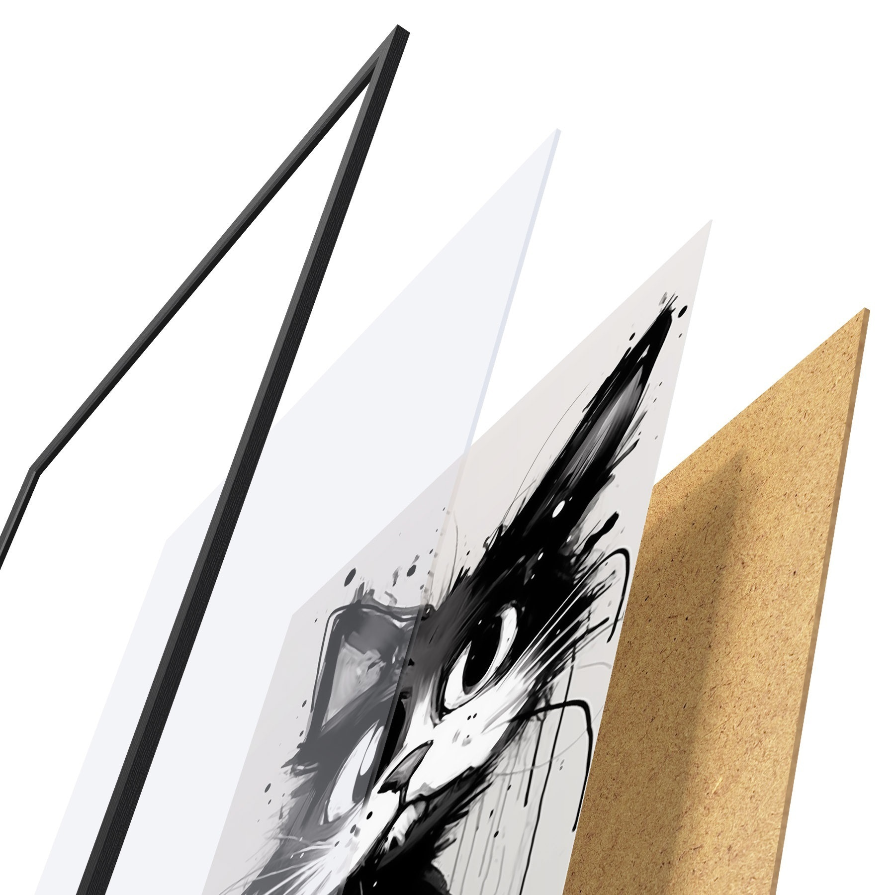 El póster consta de marco, plexiglás, imagen impresa y soporte de aglomerado. El póster puede colgarse inmediatamente en la pared gracias a los soportes de la parte posterior.