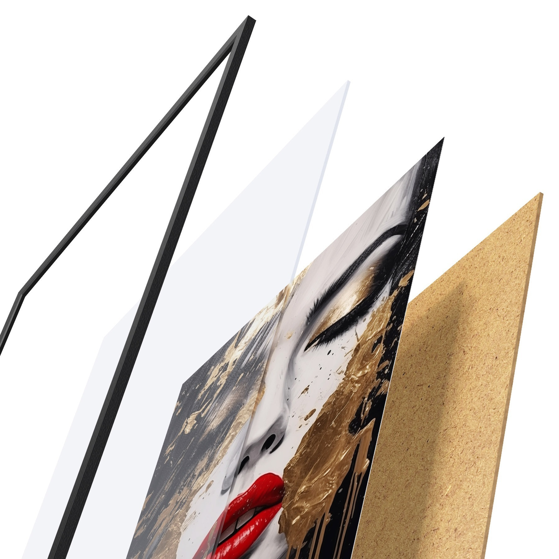 El póster consta de marco, plexiglás, imagen impresa y soporte de aglomerado. El póster puede colgarse inmediatamente en la pared gracias a los soportes de la parte posterior.