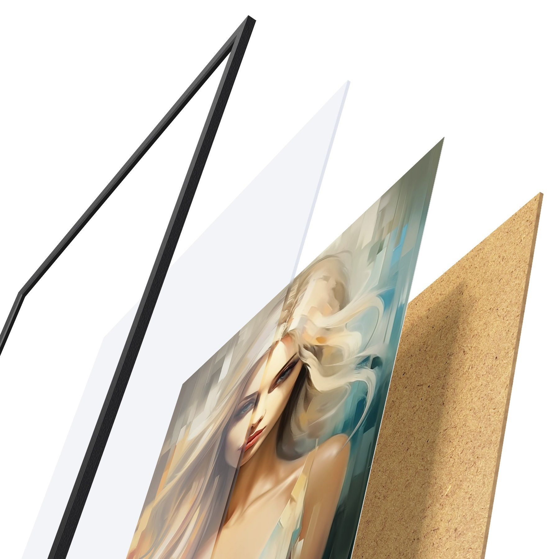 El póster consta de marco, plexiglás, imagen impresa y soporte de aglomerado. El póster puede colgarse inmediatamente en la pared gracias a los soportes de la parte posterior.