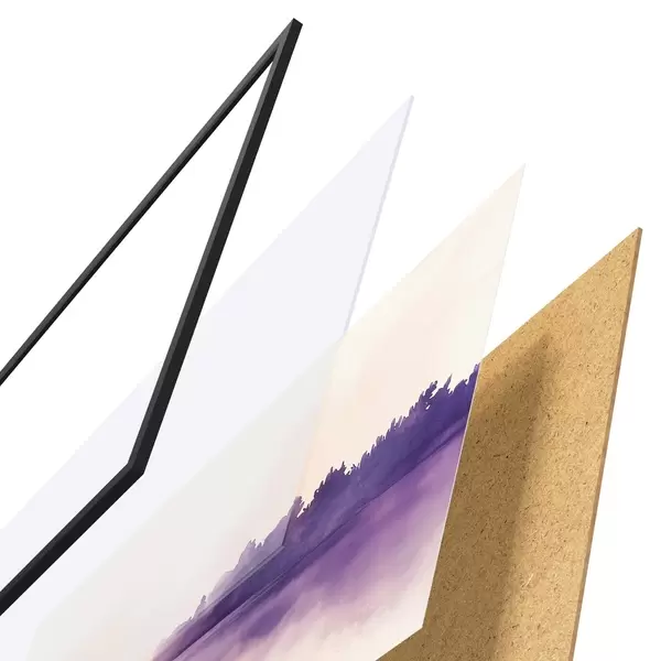El póster consta de marco, plexiglás, imagen impresa y soporte de aglomerado. El póster puede colgarse inmediatamente en la pared gracias a los soportes de la parte posterior.