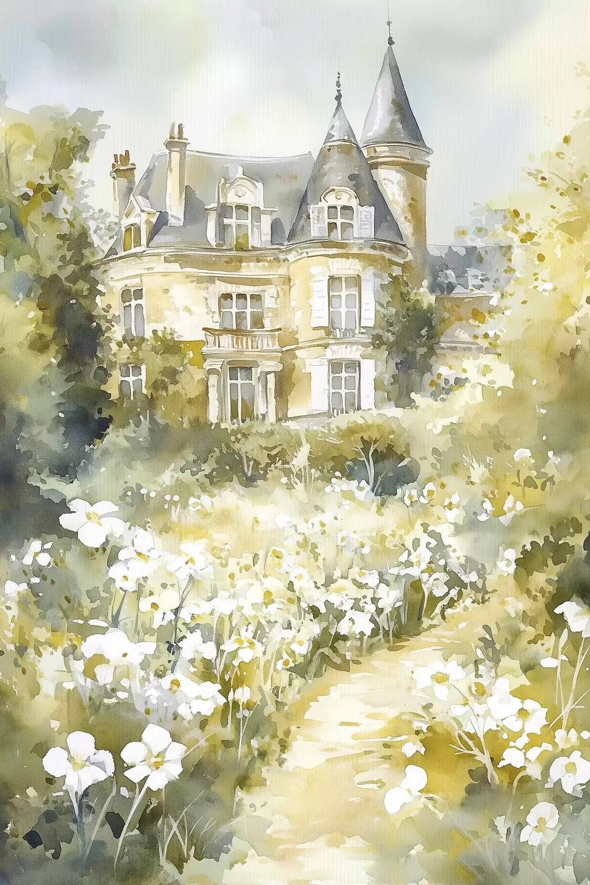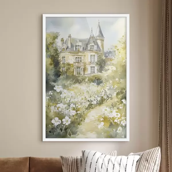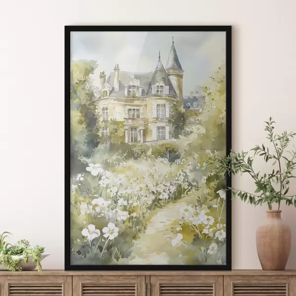 Poster Hermoso castillo con vegetación y flores blancas, estilo acuarela Nr f44506