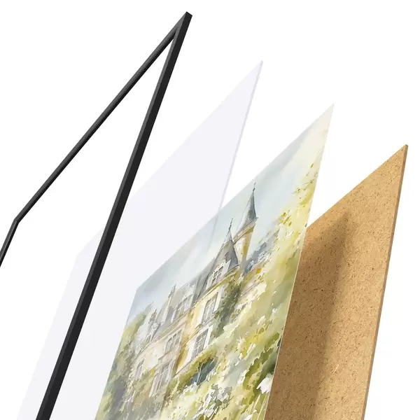 El póster consta de marco, plexiglás, imagen impresa y soporte de aglomerado. El póster puede colgarse inmediatamente en la pared gracias a los soportes de la parte posterior.