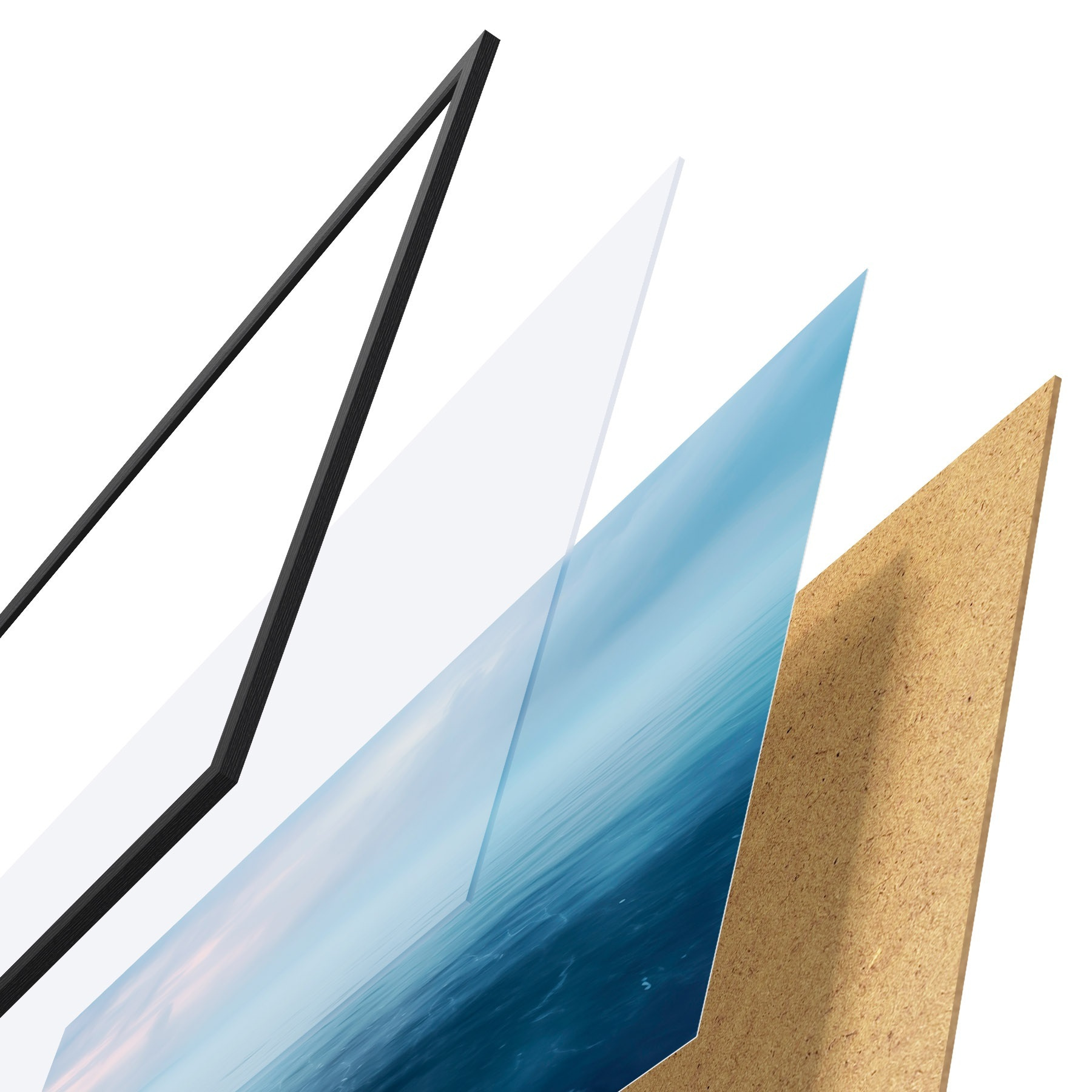 El póster consta de marco, plexiglás, imagen impresa y soporte de aglomerado. El póster puede colgarse inmediatamente en la pared gracias a los soportes de la parte posterior.