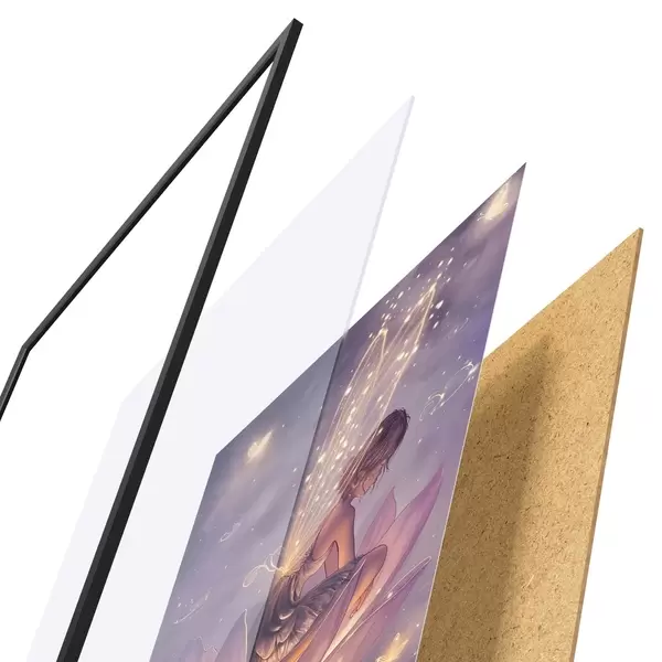 El póster consta de marco, plexiglás, imagen impresa y soporte de aglomerado. El póster puede colgarse inmediatamente en la pared gracias a los soportes de la parte posterior.