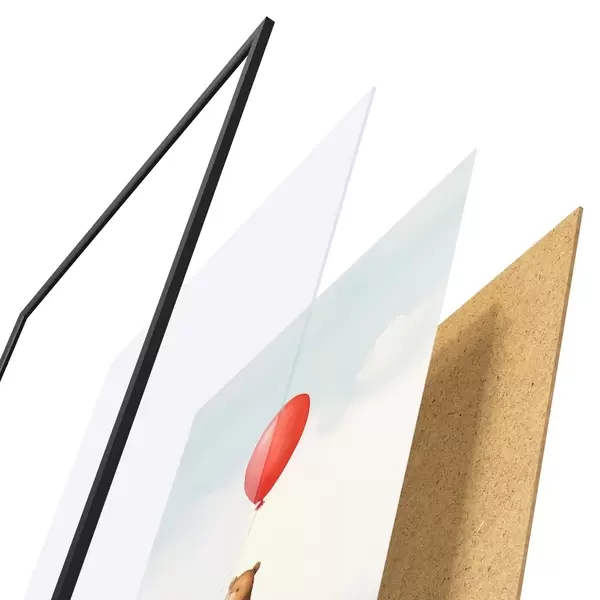 El póster consta de marco, plexiglás, imagen impresa y soporte de aglomerado. El póster puede colgarse inmediatamente en la pared gracias a los soportes de la parte posterior.