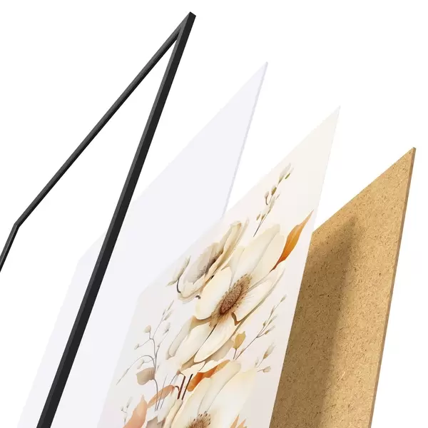 El póster consta de marco, plexiglás, imagen impresa y soporte de aglomerado. El póster puede colgarse inmediatamente en la pared gracias a los soportes de la parte posterior.