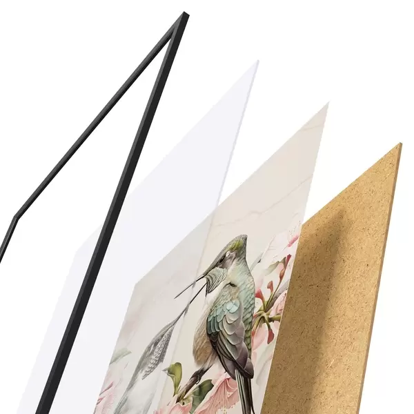 El póster consta de marco, plexiglás, imagen impresa y soporte de aglomerado. El póster puede colgarse inmediatamente en la pared gracias a los soportes de la parte posterior.