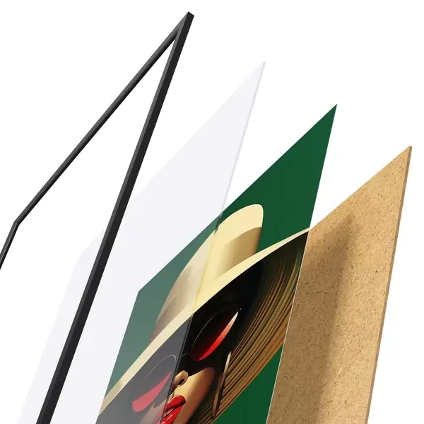 El póster consta de marco, plexiglás, imagen impresa y soporte de aglomerado. El póster puede colgarse inmediatamente en la pared gracias a los soportes de la parte posterior.