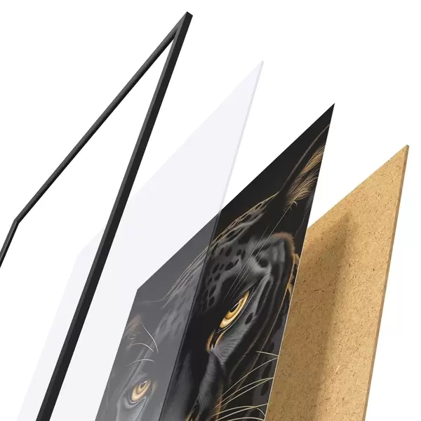 El póster consta de marco, plexiglás, imagen impresa y soporte de aglomerado. El póster puede colgarse inmediatamente en la pared gracias a los soportes de la parte posterior.