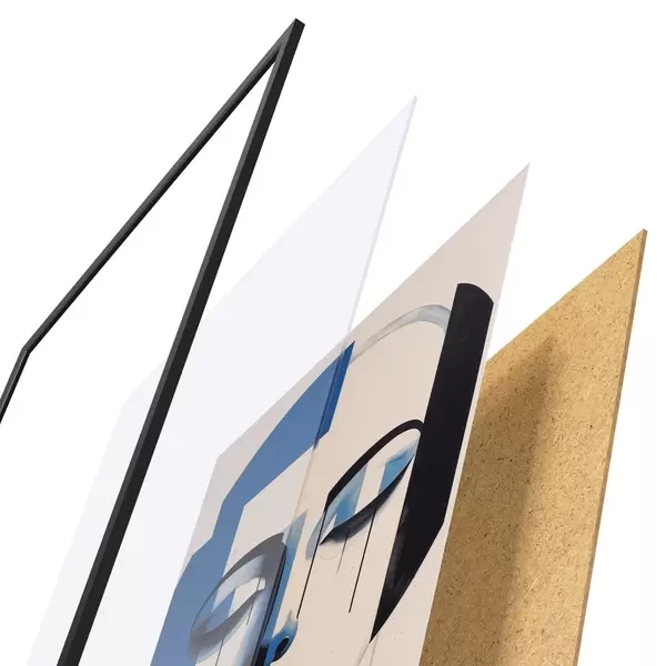 El póster consta de marco, plexiglás, imagen impresa y soporte de aglomerado. El póster puede colgarse inmediatamente en la pared gracias a los soportes de la parte posterior.