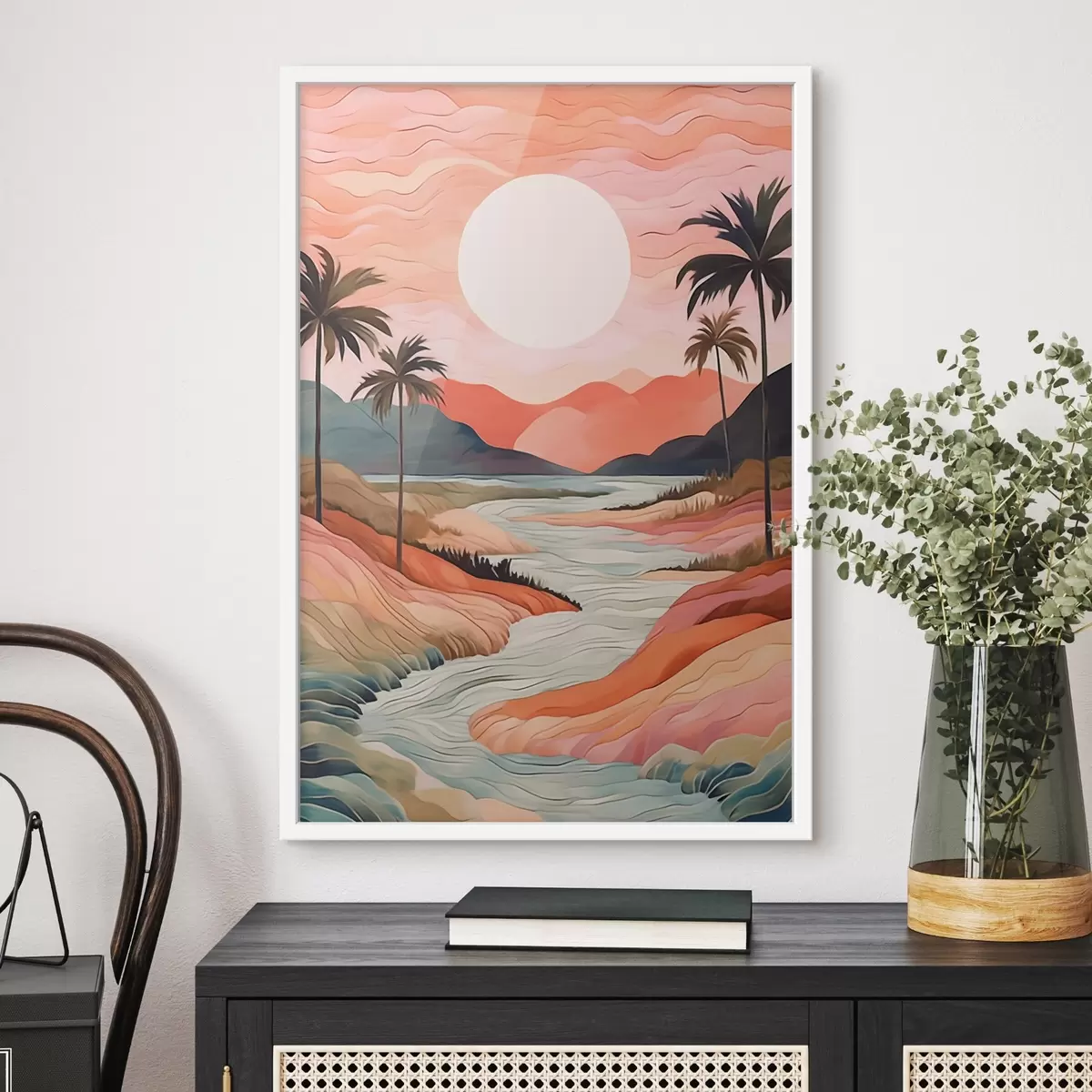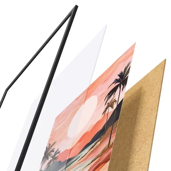 El póster consta de marco, plexiglás, imagen impresa y soporte de aglomerado. El póster puede colgarse inmediatamente en la pared gracias a los soportes de la parte posterior.