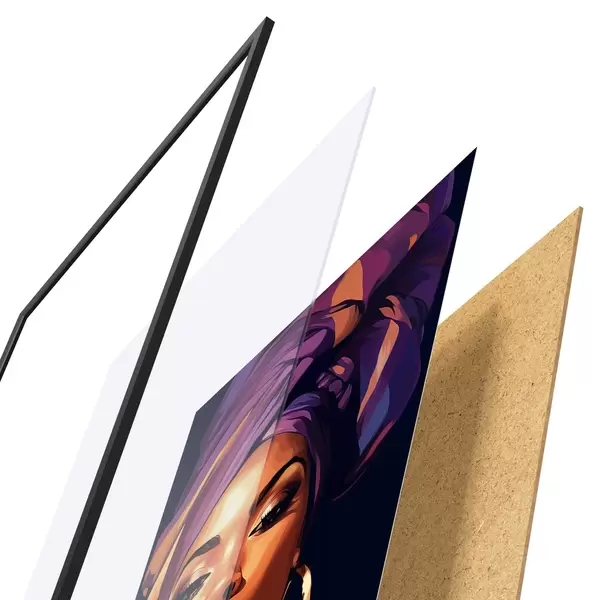 El póster consta de marco, plexiglás, imagen impresa y soporte de aglomerado. El póster puede colgarse inmediatamente en la pared gracias a los soportes de la parte posterior.