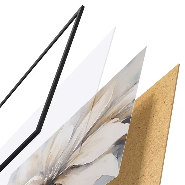 El póster consta de marco, plexiglás, imagen impresa y soporte de aglomerado. El póster puede colgarse inmediatamente en la pared gracias a los soportes de la parte posterior.
