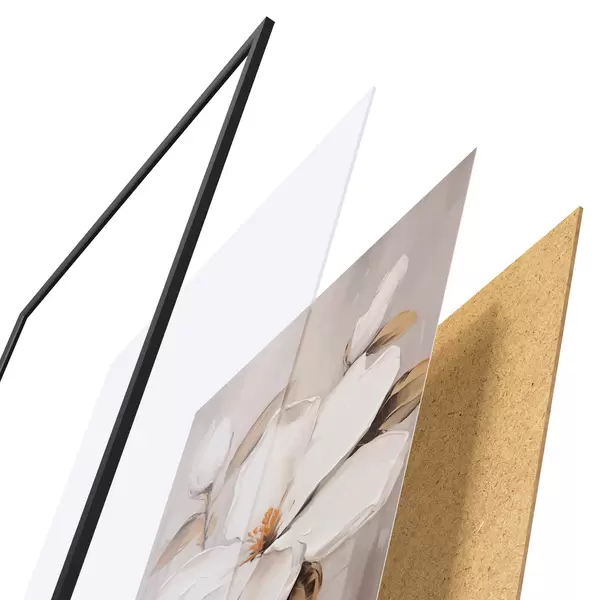 El póster consta de marco, plexiglás, imagen impresa y soporte de aglomerado. El póster puede colgarse inmediatamente en la pared gracias a los soportes de la parte posterior.