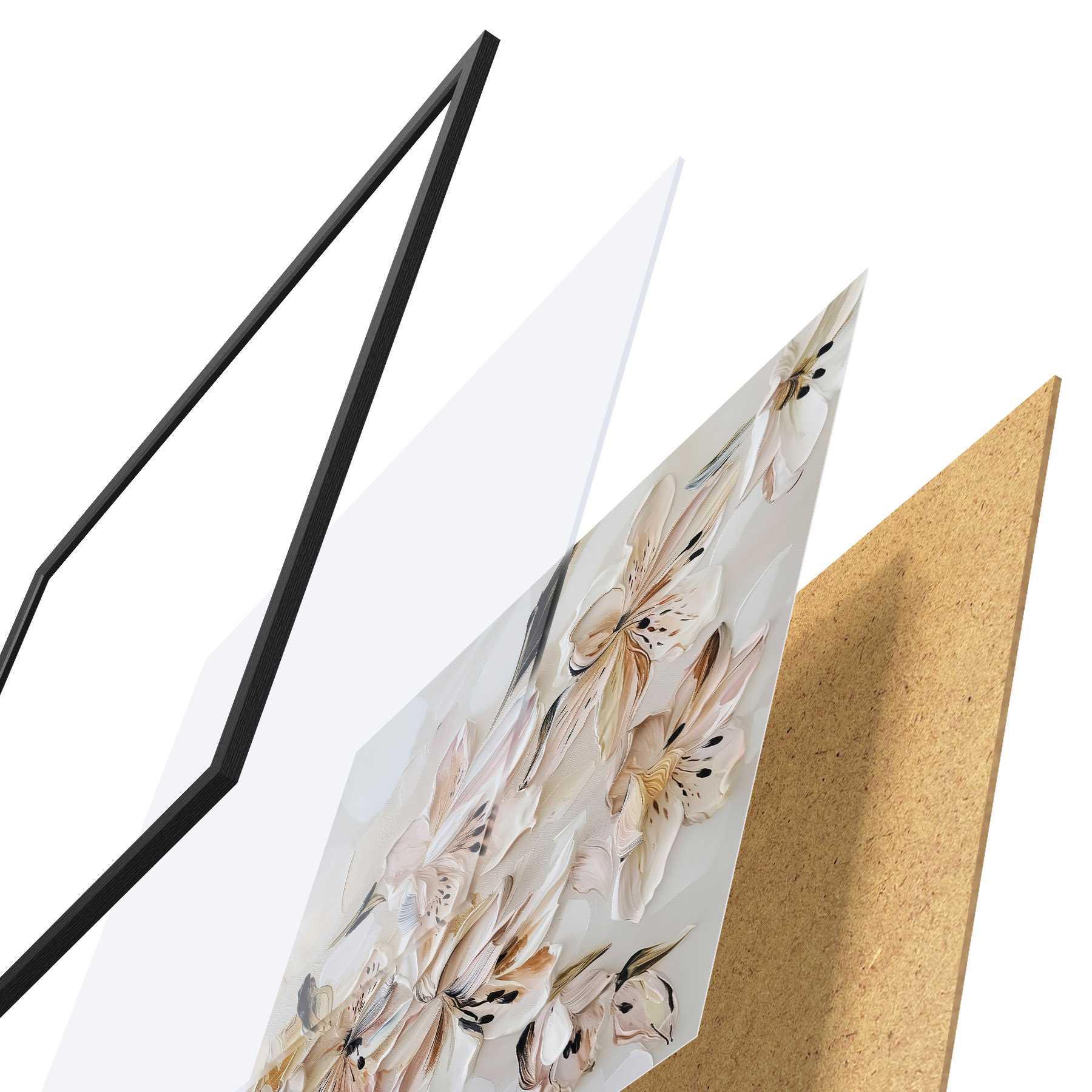 El póster consta de marco, plexiglás, imagen impresa y soporte de aglomerado. El póster puede colgarse inmediatamente en la pared gracias a los soportes de la parte posterior.