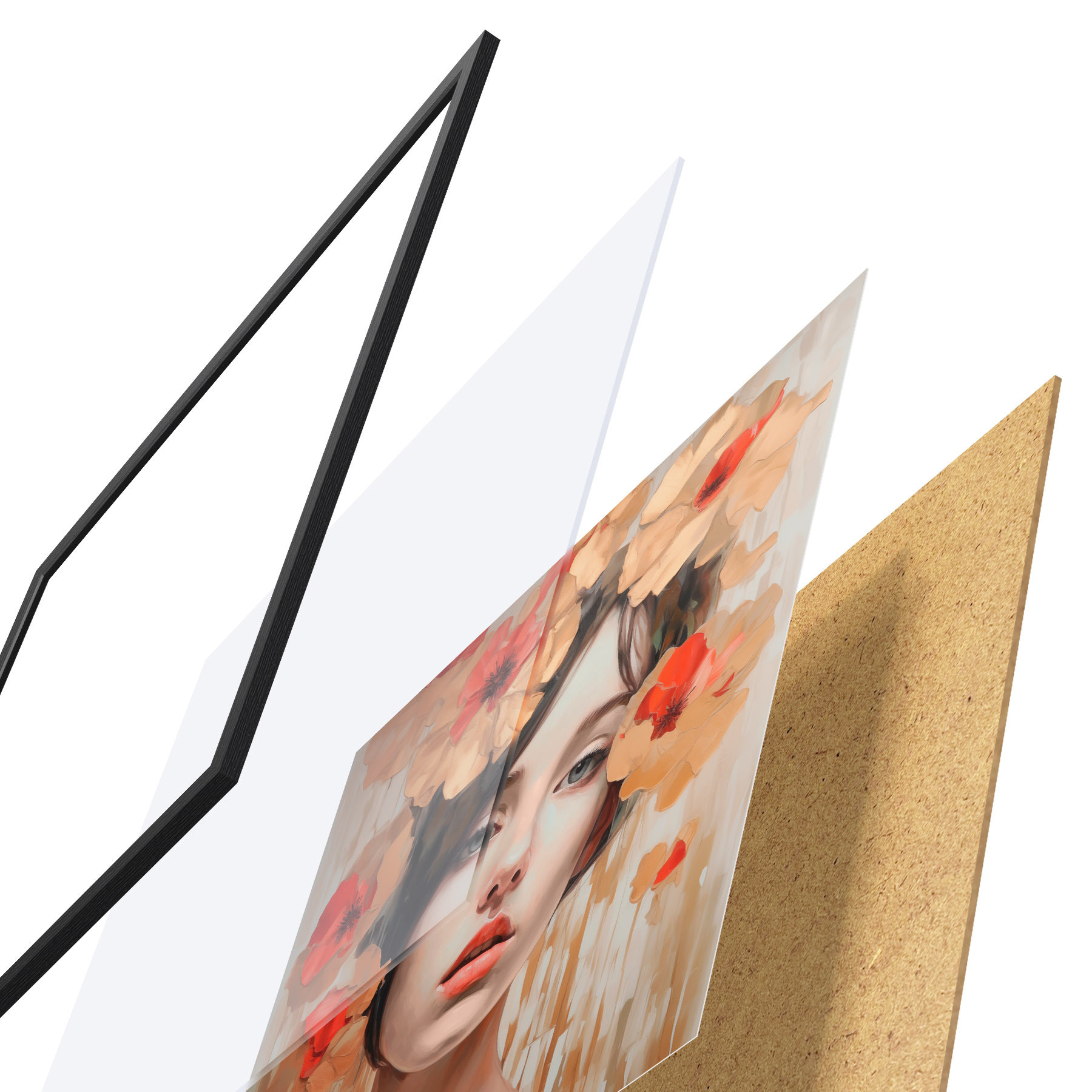 El póster consta de marco, plexiglás, imagen impresa y soporte de aglomerado. El póster puede colgarse inmediatamente en la pared gracias a los soportes de la parte posterior.