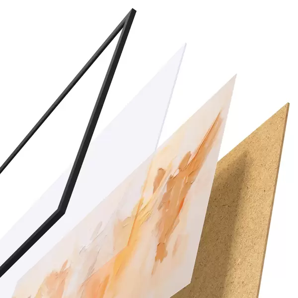 El póster consta de marco, plexiglás, imagen impresa y soporte de aglomerado. El póster puede colgarse inmediatamente en la pared gracias a los soportes de la parte posterior.