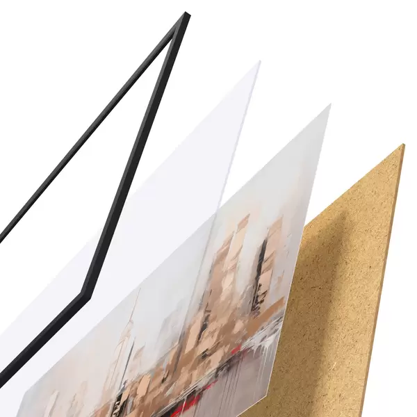 El póster consta de marco, plexiglás, imagen impresa y soporte de aglomerado. El póster puede colgarse inmediatamente en la pared gracias a los soportes de la parte posterior.
