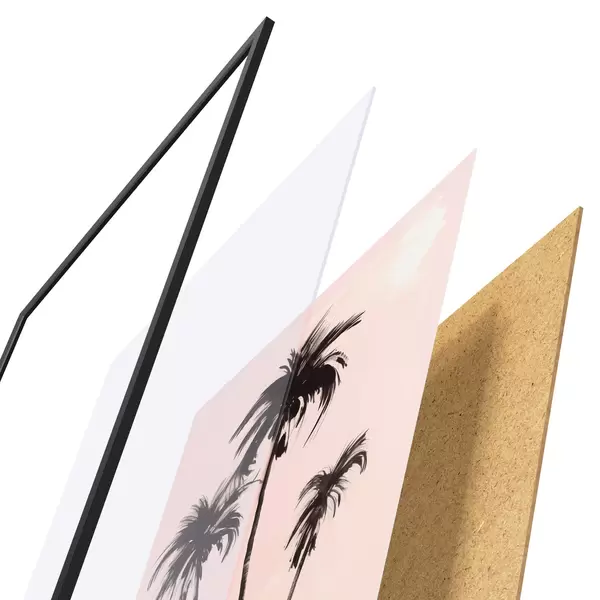 El póster consta de marco, plexiglás, imagen impresa y soporte de aglomerado. El póster puede colgarse inmediatamente en la pared gracias a los soportes de la parte posterior.