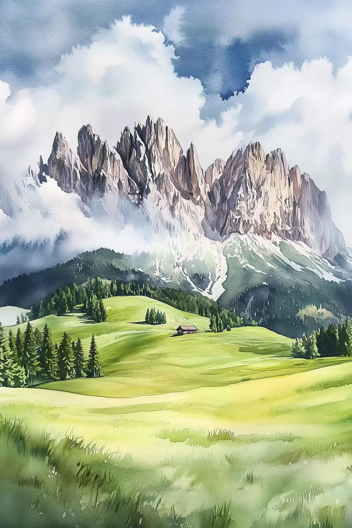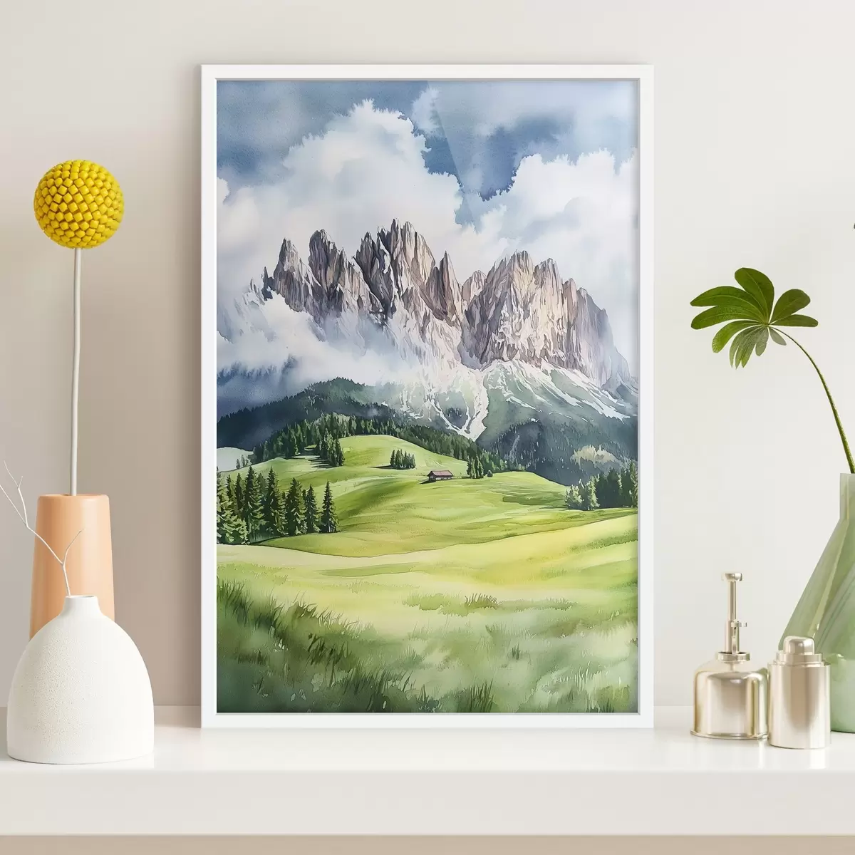 Poster Dolomitas, montañas alpinas, Italia, paisaje, estilo acuarela Nr f44601