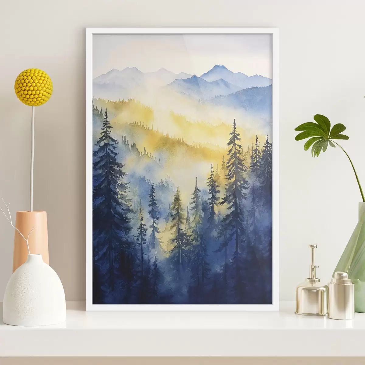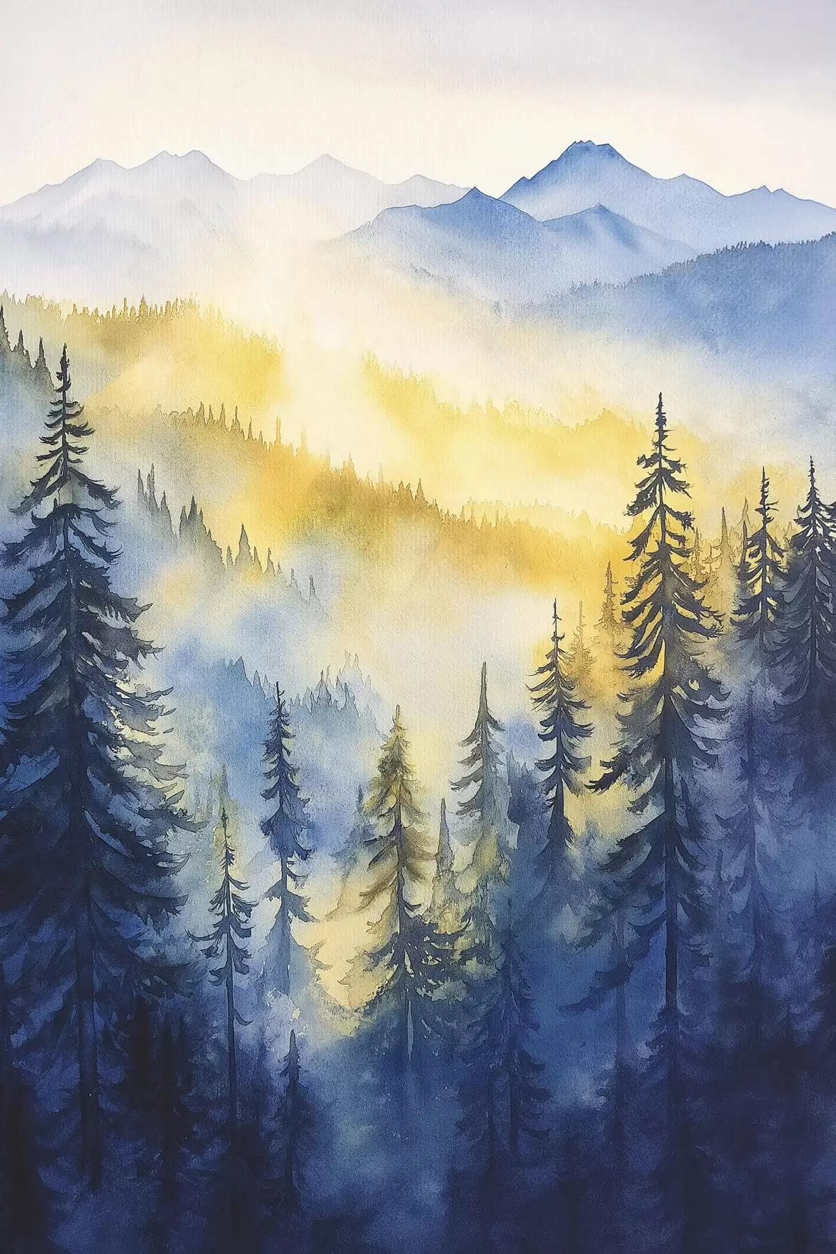 Poster Montañas neblinosas en un amanecer, pinares, colores azul y amarillo f44602