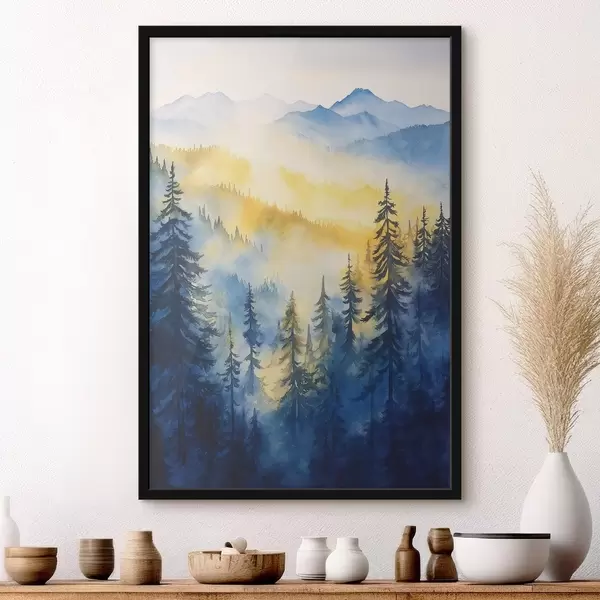 Poster Montañas neblinosas en un amanecer, pinares, colores azul y amarillo Nr f44602