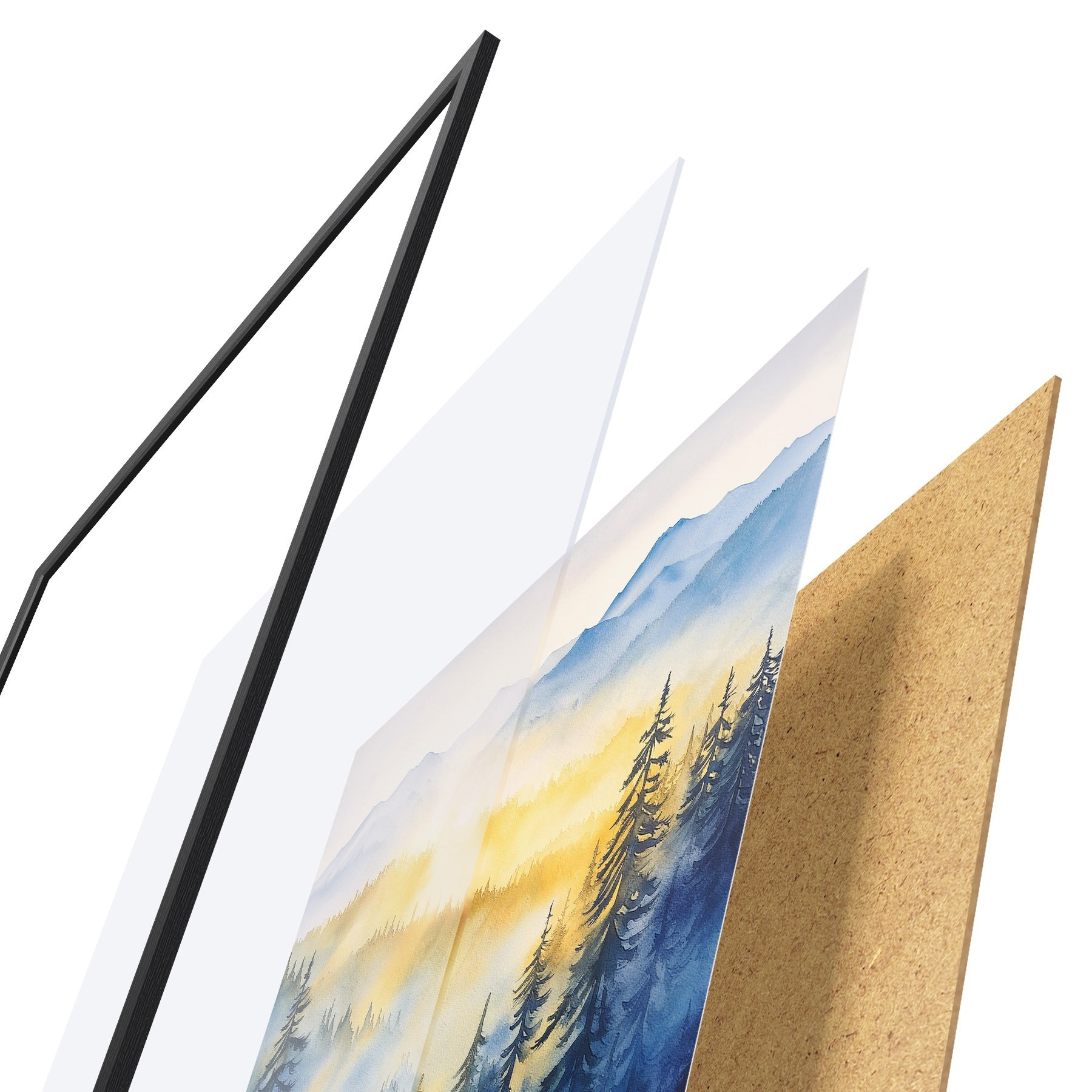 El póster consta de marco, plexiglás, imagen impresa y soporte de aglomerado. El póster puede colgarse inmediatamente en la pared gracias a los soportes de la parte posterior.