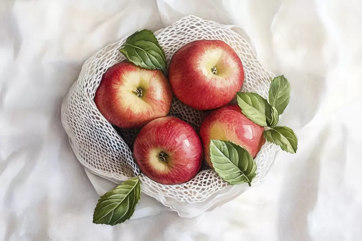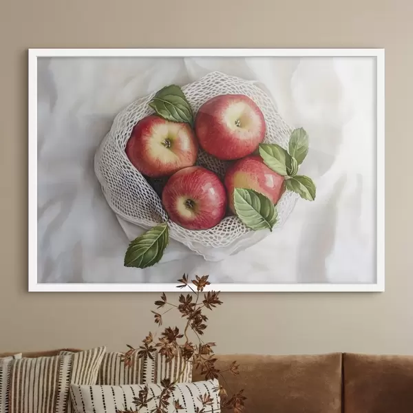 Poster Manzanas rojas en la bolsa de lino con hojas de menta, estilo rústico, frutas Nr f44609