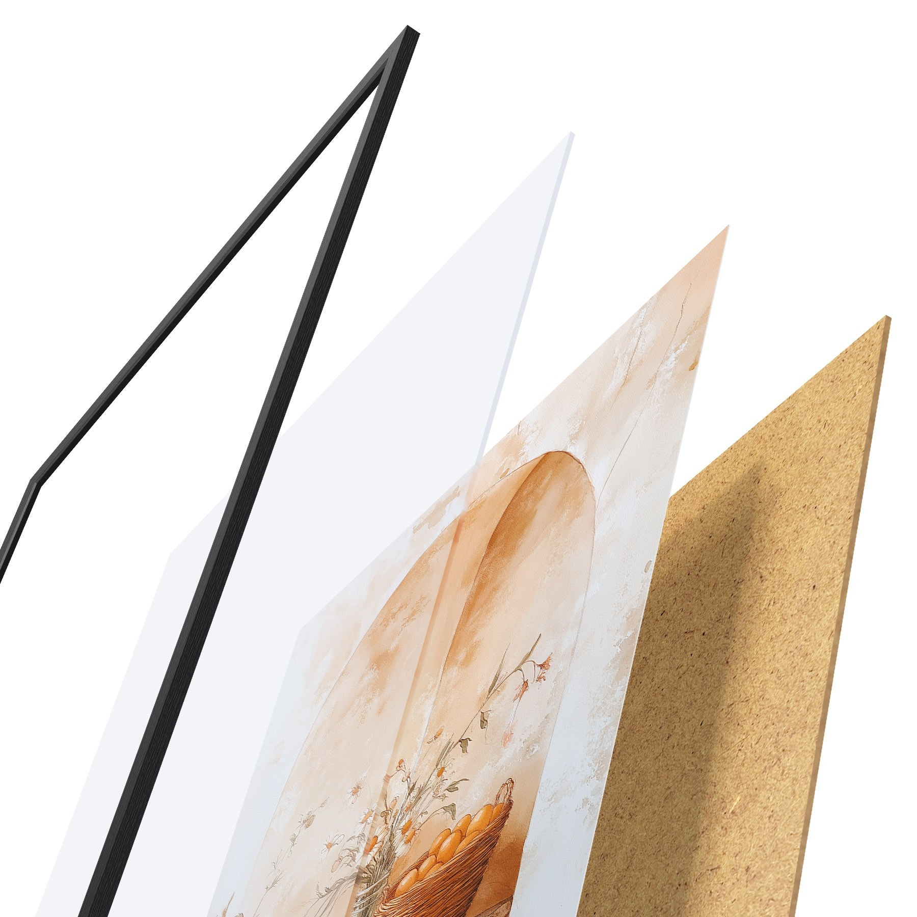 El póster consta de marco, plexiglás, imagen impresa y soporte de aglomerado. El póster puede colgarse inmediatamente en la pared gracias a los soportes de la parte posterior.